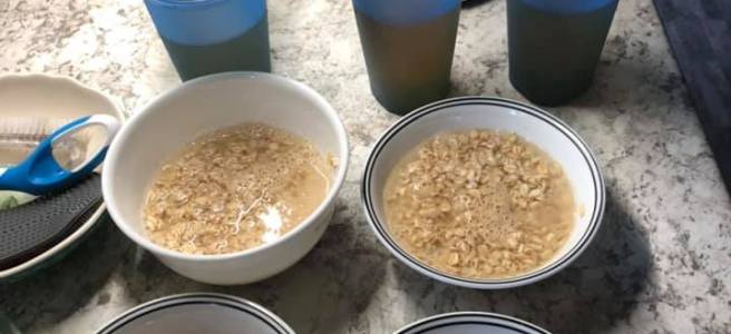 - Put old fashioned oats in a bowl and cover with water, let sit 20 minutes.