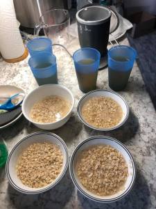 MORE NOTES: As you can see in the 2nd picture, I make multiple batches at once. I know I drink about a half gallon in a week so I make that in one pass. I do soak the oats in separate bowls AND I measure up my water, syrup, and salt into glasses so everything goes pretty smooth once the oats are done soaking. It’s easy to prep all of this after you put the oats out to soak. And then its rinse/blend/strain over and over until all batches are done.